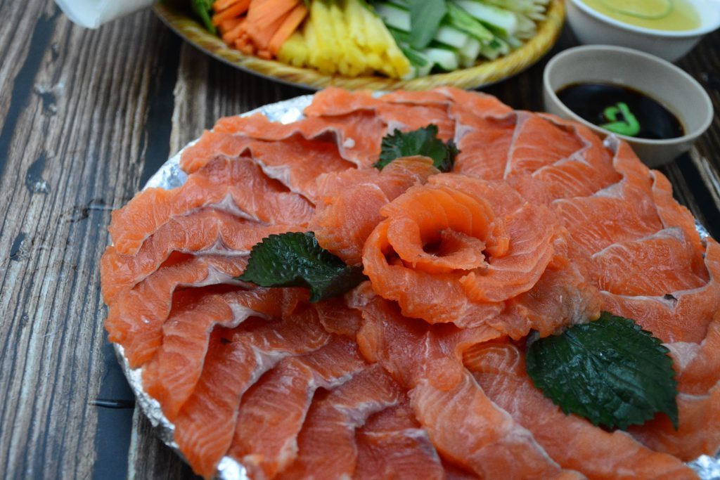Nếu nhà bạn không có đủ dụng cụ để thái miếng cá lớn hồi thành dĩa Sashimi hoặc không có thời gian để làm chuyện đó, Amazing Foods sẽ hỗ trợ cắt cá hồi thành khay Sashimi, kèm theo nước tương và mù tạc, các bạn chỉ việc mang về và thưởng thức cùng gia đình bạn bè, thật quá tiện lợi và vô cùng rẻ so với bỏ tiền mua tại các tiệm Sushi phải không nào.