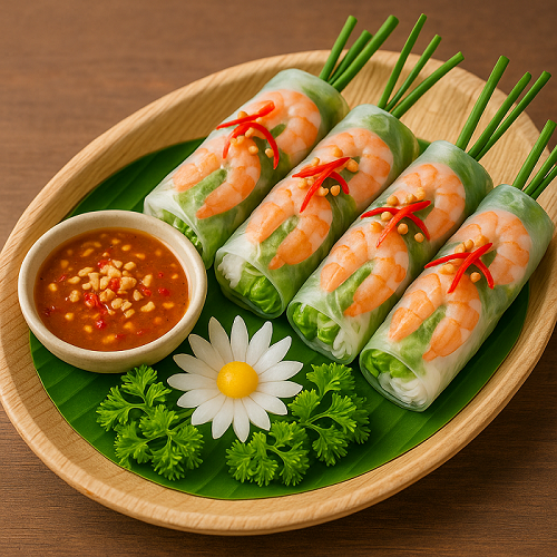 Phong cách Việt truyền thống: Món nem cuốn, gỏi cuốn đặt xen kẽ màu sắc, thêm hoa dưa leo tỉa thủ công.